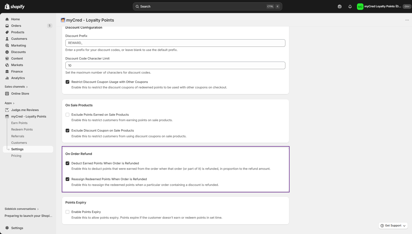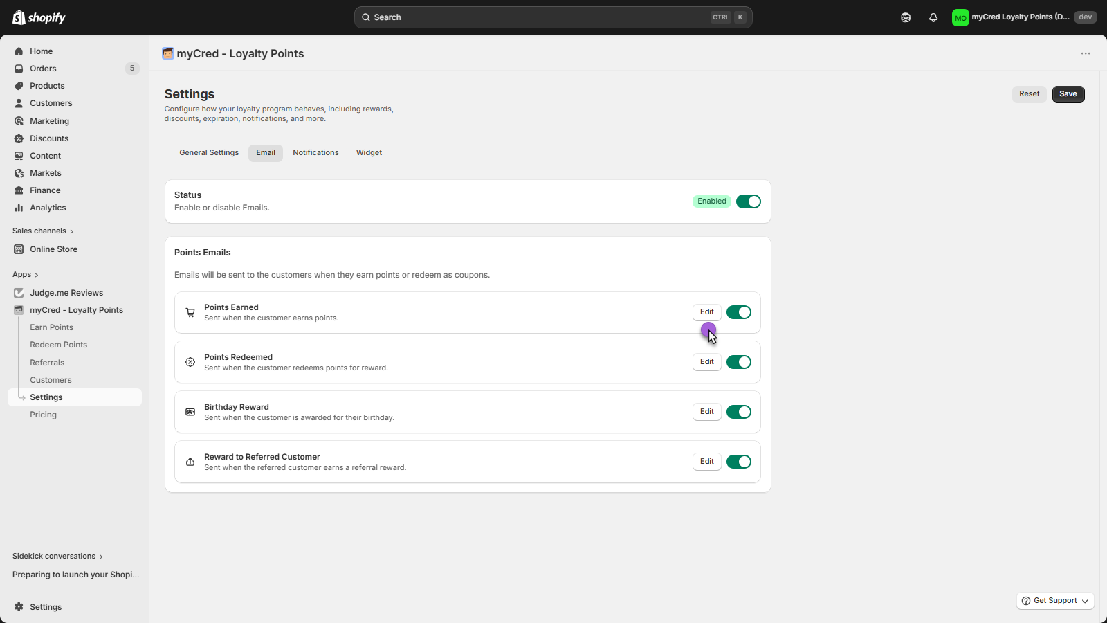 The Settings section allows you to control how loyalty points, discounts, notifications, and the widget behave across your store.